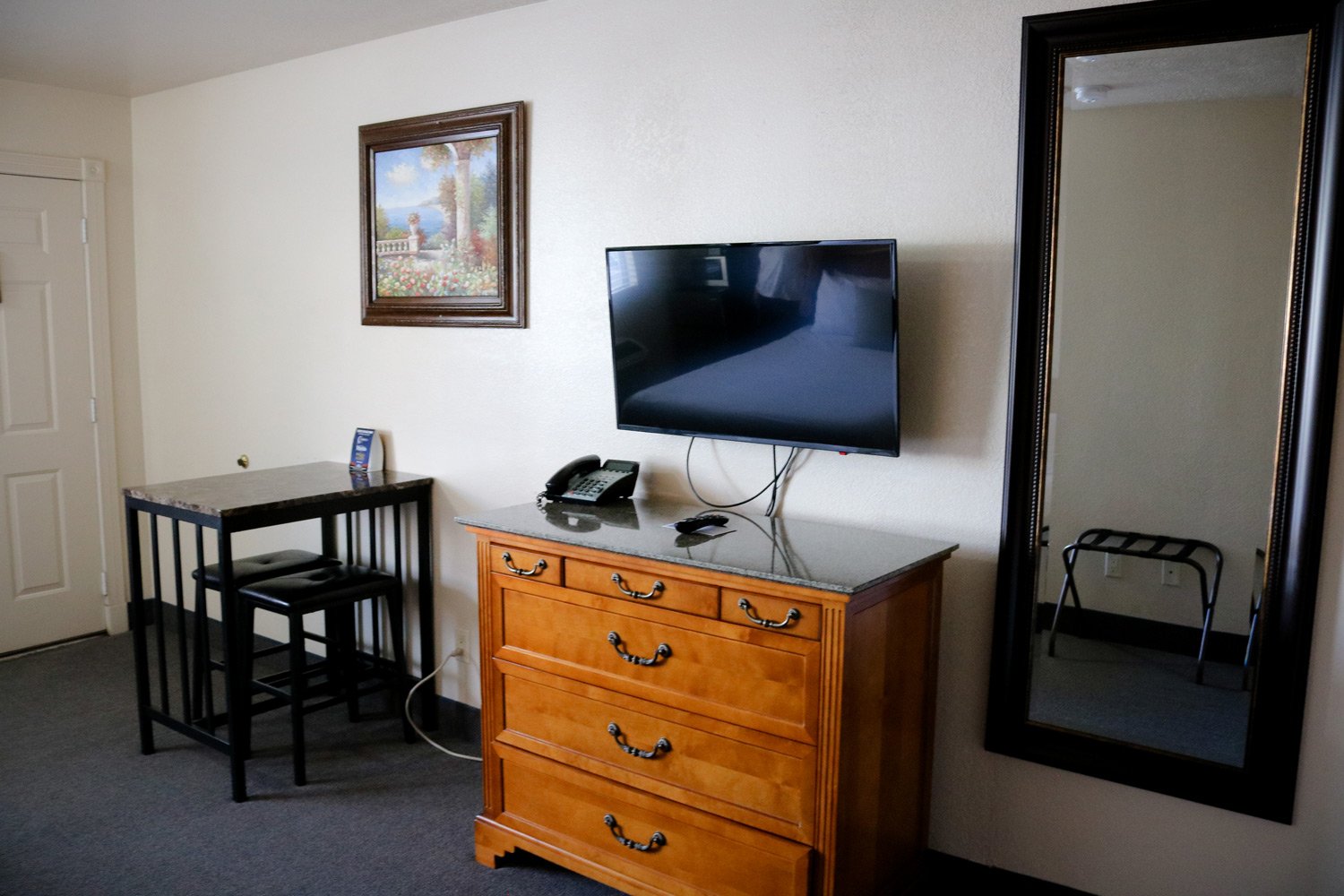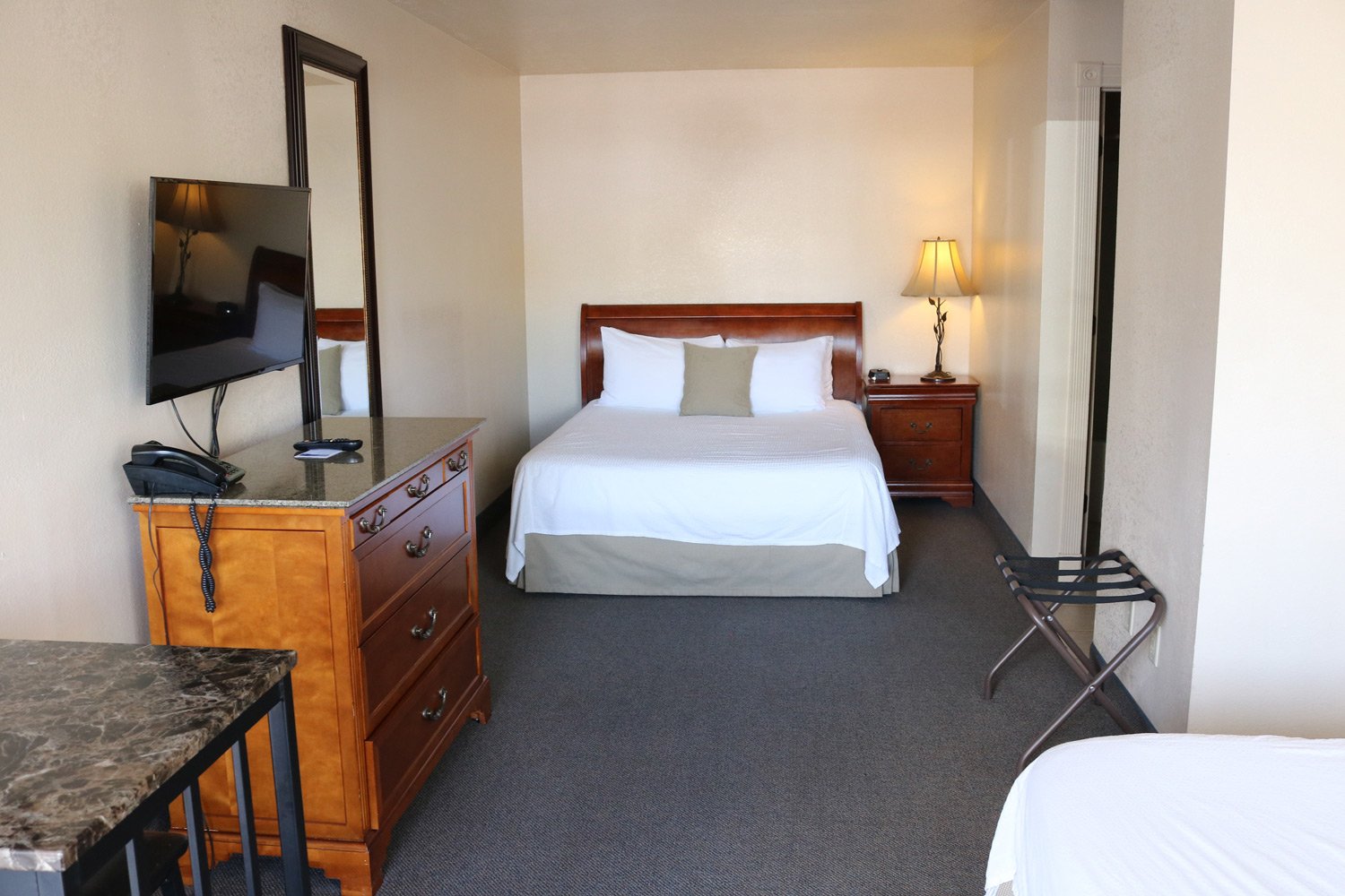 This room features two queen beds. Each of the beds have nightstands and the room has a mini-fridge, microwave, and small-sized dinette table. The bathroom has granite countertops and beautifully lighted mirrors above the sink.